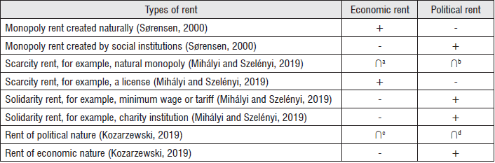 Different definitions of rent are contained within one another or have common parts. Table 1 shows this phenomenon on examples of the relationship between the definitions of Sřrensen (2000), Mihályi and Szelényi (2019), and Kozarzewski (2019), and the definitions of economic and political rent presented above. If rent in any of these definitions is included in the definition of economic rent or political rent, it is marked with a (+) sign and, if not included, with a (-) sign. If the definition has parts in common with the definition of economic or political rent, it is marked with a (∩) sign. An explanation of the common part of both definitions is also attached.
