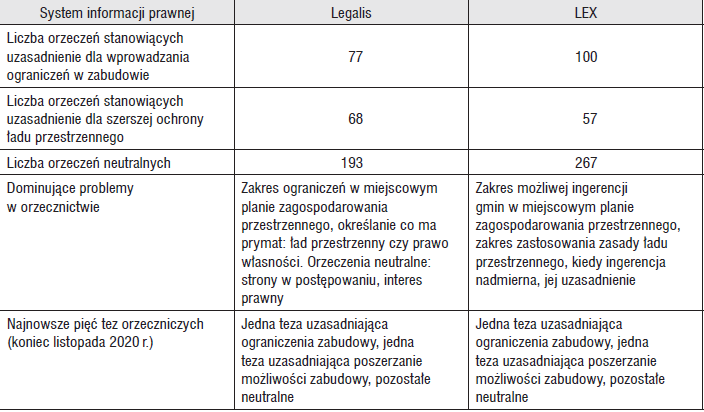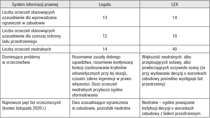 Te ostatnie to tezy albo niedotyczące wprost wskazanego problemu, albo bardzo ogólnie sformułowane (w konsekwencji nie wynikają z nich żadne wnioski), albo wprost ograniczające się do powielania wyrażeń ustawowych. Ujęcie konkretnej tezy orzeczniczej w danej grupie nie jest równoznaczne z jej pozytywną/negatywną oceną z perspektywy formalnoprawnej (tym bardziej, że trzeba podkreślić zróżnicowane stany faktyczne stanowiące podstawę dla wydania poszczególnych orzeczeń). Poniżej przeprowadzono szerszą dyskusję na temat konkretnych kierunków orzeczniczych. Jest to bardzo istotne, niemniej w ramach samej klasyfikacji nie można jednoznacz- nie przyjąć, że opowiedzenie się przez sąd w określonym przypadku za możliwością zabudowy jest szkodliwe dla ładu przestrzennego i zasługuje na krytykę z perspek- tywy wartości systemu gospodarki przestrzennej. Systemy informacji prawnej Lega- lis i LEX zawierają często te same tezy orzecznicze. Z perspektywy artykułu nie sta- nowi to jednak istotnego zagadnienia. Chodzi bowiem nie tylko o charakterystykę orzecznictwa jako całości (tym problemom poświęcono inne analizy), ale określenie faktycznego wpływu orzeczeń na praktykę (i ich konkretnego odbioru przez użyt- kowników przestrzeni i podmioty polityki przestrzennej). Ten aspekt może zostać zweryfikowany właśnie przez całościową analizę najbardziej popularnych systemów informacji prawnej. Jednocześnie należy podkreślić, że przy klasyfikacji tez orzecz- niczych często muszą decydować konkretne podejścia składów orzeczniczych do danego zagadnienia. Nie można opierać się tylko na tym, czy dany wyrok prowadzi do ograniczenia lub poszerzenia możliwości zabudowy. Trzeba ocenić, jak od strony argumentacji prawnej jest to uzasadniane.