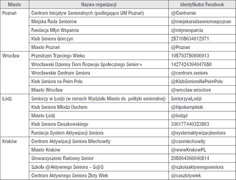 analizy włączone zostały oficjalne profile miast. Celem było uwzględnienie kontekstu miasta, tego, co się w nim dzieje, i ewentualne zaobserwowanie, czy miało to wpływ na treści publikowane na poszczególnych stronach organizacji. W tabeli 1 znajdują się podmioty włączone do analizy. Zakres danych, tj. postów, został ograniczony do czterech miesięcy – od 1 stycznia do 30 kwietnia 2020 r., celem było uchwycenie momentu wybuchu pandemii i reakcji na nią.