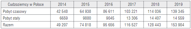 Analizując migrację na terenie Polski w latach 2014–2019, posłużono się bazą danych Urzędu do Spraw Cudzoziemców. Pięcioletnia obserwacja (2014–2019) danych wskazuje na wzrost migracji o 212% bez podziału na rodzaj pobytu (tabela 1). Biorąc pod uwagę dwa najczęstsze rodzaje pobytów (stały i czasowy) cudzoziemców w Polsce, zauważamy wzrost pobytu czasowego o 227%, natomiast wzrost pobytu stałego o 119%.