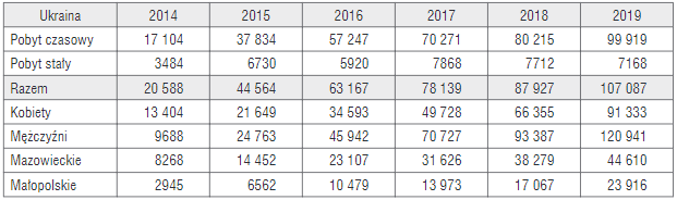 Cudzoziemcy przybywający do Polski w ostatnich pięciu latach najczęściej pochodzili z Ukrainy, to właśnie oni stanowili 65% wszystkich obcokrajowców. Kobiety stanowiły 43% przyjezdnych, a mężczyźni 57%. Zanotowano wzrost migracji obywateli Ukrainy w latach 2014–2019 o 420%, pobyt czasowy wzrósł o 484%, a pobyt stały o 105%. Najwięcej osób osiedliło się na terenie woj. mazowieckiego, co stanowi 40% wszystkich Ukraińców, drugim województwem pod tym względem jest woj. małopolskie – 19% (tabela 2).