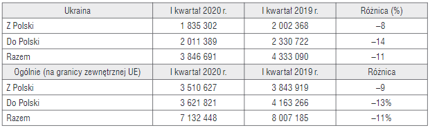 W tabeli 3, opartej na danych pochodzących ze Straży Granicznej w okresie od 1 marca do 30 kwietnia, widać, że ogólna liczba przyjazdów Ukraińców do Polski w stosunku do wyjazdów zmniejszyła się o 28%. Wyjechało ok. 160 tys. osób pochodzenia ukraińskiego. Aby odnieść dane do poprzedniego roku, porównano je z I kwartałem 2019 r. w liczbie przekroczeń granicy przez Ukraińców w Polsce (tabela 4).