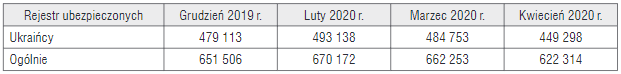 Analizując dane zawarte w tabeli 5 dotyczące rejestru ubezpieczonych, którzy legitymowali się innym obywatelstwem niż polskie, możemy odnotować spadek liczby osób zgłoszonych do ubezpieczenia emerytalnego i rentowego. Dla obywateli Ukrainy, porównując luty 2020 r. z kwietniem 2020 r., notujemy spadek o 8,9%, dla ogólnej liczby zgłoszonych do ubezpieczenia cudzoziemców spadek ten wynosi 7,2%.