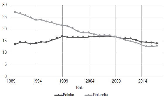 Ilustracją dobrze zaprojektowanych i wdrożonych rozwiązań z zakresu polityki publicznej może być przykład Finlandii, gdzie liczba samobójstw w latach 1990–2015 obniżyła się ponad dwukrotnie (z 26,96 na 100 tys. mieszkańców do 12,62 na 100 tys. mieszkańców). Wciąż jest minimalnie wyższa niż średnia dla krajów Unii Europejskiej, ale wielokrotnie w tym okresie wyższy wskaźnik samobójstw miała Polska (Global Burden of Disease, 2018). Przede wszystkim jednak w analogicznym okresie wskaźnik samobójstw w Polsce ledwie drgnął – i to niestety, pogarszając się (13,57 w 1990 r. do 13,95 w 2015 r.)3. Rozkład danych z lat 1990–2017 przedstawia rysunek 1.