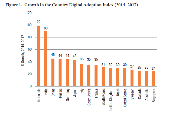 India has over 560 million Internet subscribers (2018), second only to China. Indian mobile data users consume 8.3 gigabits (GB) of data each month on average. In the year 2018, 12.3 billion apps were downloaded, 560 million people subscribed to the Internet, 354 million people used smartphone devices, and 294 million users engaged in social media (McKinsey Global Institute, 2019). India is the second-fastest digital adopter among 17 nations (Figure 1). As per reports received from 358 operators as compared to 360 operators, the total number of Internet subscribers increased from 743.19 million at the end of March 2020 to 749.07 million at the end of June 2020, with a quarterly growth rate of 0.79%. Out of total 749.07 million Internet subscribers, 698.23 million were broadband subscribers, and 50.84 million were narrowband subscribers. Wired Internet subscribers increased from 22.42 million at the end of Mar 2020 to 23.06 million at the end of June 2020, with a quarterly growth rate of 2.86%. Wireless Internet subscribers increased from 720.78 million at the end of March 2020 to 726.01 million at the end of June 2020, with a quarterly growth rate of 0.73% (TRAI, 2020).