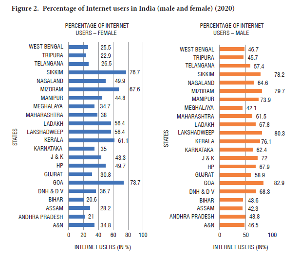The male and female ratio of Internet users in India is at a higher rate compared to other developing countries, and the states have lower variance of Internet usage between male and female citizens (Figure 2).