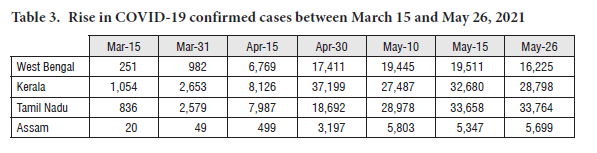 From the beginning of the pandemic until April 6, Assam reported 218,740 COVID-19 cases. On April 19, this number reached 225,822 – over 7,000 cases since April 6. During the same period, the state reported 33 deaths (Singh, 2021). In about a 40 day period between February 8 and March 17, Assam reported 14 deaths and 643 cases. However, during the one-month period between March 17 and April 19, it reported 43 deaths and 7,950 cases. There was a steep increase in the confirmed cases from March till May 2021 (Table 3). While it is debatable whether the election contributed to the spread of the virus, the upward trend reveals that there are possibilities for that.