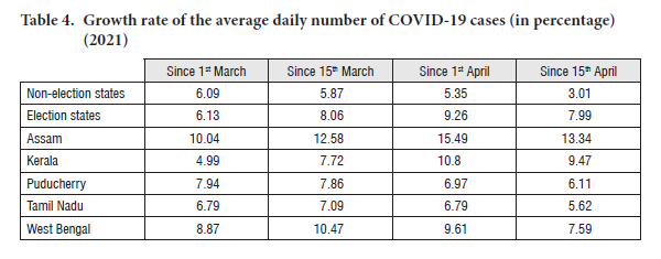 Almost on a daily basis, these states then witnessed large gatherings of people in election rallies, without masks and without social distancing. This created a fertile ground for the rapid transmission of the virus across a wide section of the population. The trajectory of COVID-19 cases in these states reversed: from declining trajectories, we could see rising trajectories from early March (Basu, 2021). As the election rallies continued, the growth rate of average daily cases accelerated. The result was the explosion of cases that overwhelmed the healthcare system (Table 4). Once the surge in the number of cases emerged in the election states, it quickly overtook the average number of cases in the non-election states.