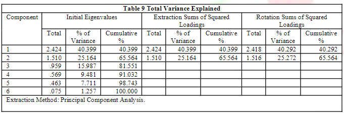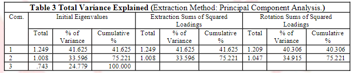 Then, we compare the Total variance (Table 3) which shows the variance explained by each factor and the rotated factor matrix indicates the group of variables. Finally, we summarized the main findings obtained from the results predicted in tabular form.