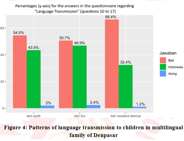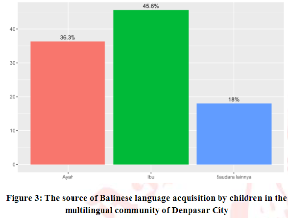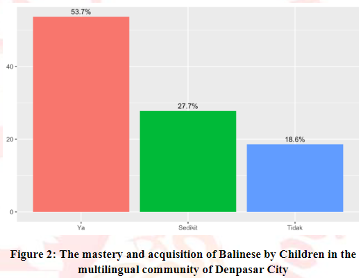 The results in Figure 1 and Figure 2 show that parents being in the closest environment to children did not transmit the Balinese language well to their children. As a result, the children cannot acquire and at the same time master the Balinese language fully. Despite this Balinese is still the main language of communication in the family.