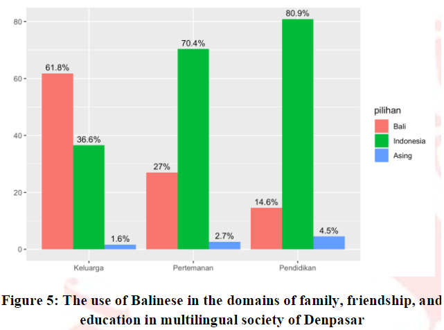 As mentioned earlier, this study develops the framework of Fishman (1972) and Holmes (2001) with necessary adjustments. The domains that are discussed are the domains of family, friendship, and education. The results indicate variations in the use of Balinese in these three domains. Only in the domain of family does the use of Balinese show a high tendency (61.8%), whereas in the other two domains namely the friendship and education domains, Balinese only reaches 27% and 14.6% (see Figure 5). The use of Indonesian is very dominant in these two domains, 70.4% in friendship and 80.9% in education. Therefore, the Balinese language is used in the domain of family while in the other two domains the Indonesian language is widely used.