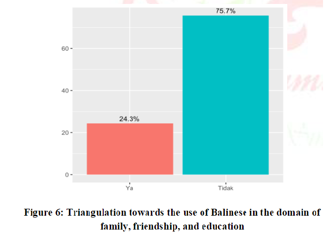 The above results show that there is a contradiction between language mastery, language acquisition, and language use. Parents who master Balinese suggests that Balinese can be used as a model of inheritance although children do not master the Balinese language. Contradictions began to be seen from the inconsistency of parents when transmitting the language to their children. Parents cannot be relied upon for the survival of the Balinese language because they choose a mixed language strategy in the family domain and this can cause language shift. Furthermore, in other domains such as friendship and education, Indonesian rather than Balinese is dominant. Consequently, the child’s acquisition and use of Balinese in the three domains are adversely affected. This analysis is justified by the results of the triangulation which was carried out by observation where the use of the Indonesian language was dominant in all domains (75.7 % in Figure 6). This is also confirmed by the results of interviews with selected subjects.