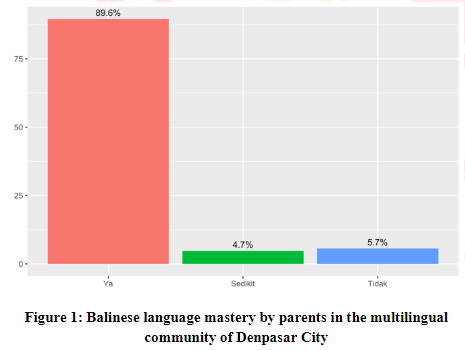 The results of this study indicate that predominantly Balinese parents (father, mother) mastered Balinese in the multilingual community in the city of Denpasar. The results showed a significant number of parents (89.6%) had mastered and could speak Balinese from birth (see Figure 1), and only 4.7% and 5.7% said they did not master the language and could not speak Balinese.