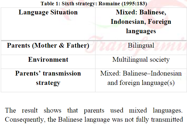 The result shows that parents used mixed languages. Consequently, the Balinese language was not fully transmitted to their children. This is because the parents are equally bilingual, in the sense that both fathers and mothers master the Balinese and Indonesian languages equally well. Consequently, they can no longer distinguish whether they are using Balinese or Indonesian in their daily conversation. Furthermore, the environment is supportive of this use of a mixed discourse because the speech community is multilingual. This results in parents not being able to transmit only Balinese.