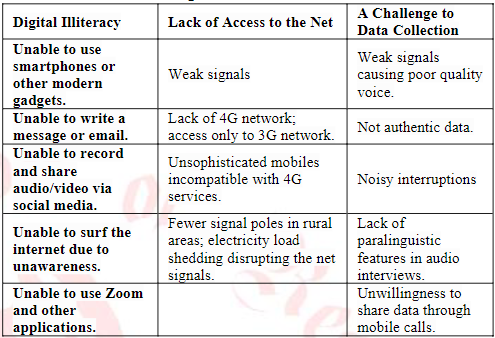To probe further, the coresearchers were questioned on how the digital divide during the pandemic affected the Bagri community, and how the divide posed challenges to collecting data from the community. Almost all the coresearchers responded that many among the Bagri community are not digitally aware. Given the multifaceted impacts of digital divide on the Bagri community as reflected, it is difficult to categorize or classify the impacts due to lack of research on the community. Digital illiteracy, on the one hand, the weak internet network, on the other hand, have brought about digital, social degradation of the Bagri community. Digital illiteracy among the Bagris implies that the community lacks digital skills to use smartphones, sophisticated applications, and other gadgets for social communication and transmission of information. This situation has made it difficult for the coresearchers to contact the Bagris and collect data from them. A tabulated presentation shows what digital divide means for the coresearchers (see Table 2).
