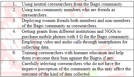 Coresearchers employed to collect data from the Bagri community need to be chosen carefully. They must be impartial and not have a negative view of the Bagri community. They should be known to the important people in the community so that these gatekeepers can give them access to the community. They should be both men and women. It is good if some of them are members of the community so that it can be easier to make inroads to the community. Moreover, they should be given training on conducting surveys and interviews of the community. However, when coresearchers are led by their partiality, this can affect validity of data as one of the coresearchers added, “Researchers should be free of class/caste bias because it is their job to conduct objective research. If researchers retain such bias, this may affect authenticity of research. Yes, data might be collected through a third person or a mobile application”. (Refer Table 2).