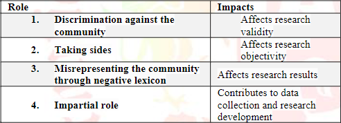 The coresearchers’ bias is also manifested in the recurrent use of many negative lexicons that form the coresearchers’ discourses about the Bagri community often resulting in discrimination against the community and posing challenges to data collection. The coresearchers usually deploy words and terminologies that typically characterize their biased views of the Bagri community. Here we list some of those words to substantiate this point: