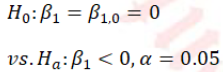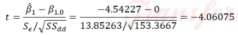This is located in the rejection zone. In favor of H0, we reject H0 At the 5% level of significance, the statistics support the conclusion that β1 is negative, implying that as the number of absentees grows, the average final exam score declines. As previously stated, the figure is a point estimate of how much one additional absentee affects the average final exam result. The average reduces by around 4.54227 points for each subsequent absentee.