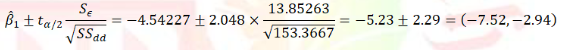 We are 95 percent positive that, among all students who have ever taken this course, the average final test score drops by 2.94 to 7.52 points for each extra class missed. If we focus on the sub-population of all students who had exactly five absences. We may estimate the average final test score for those students using the least squares regression equation