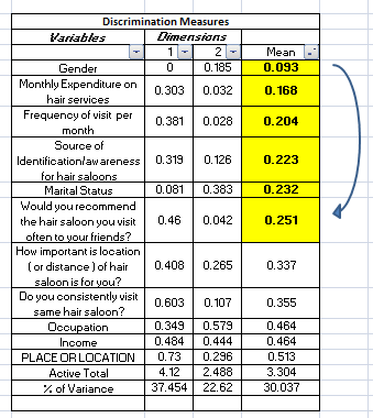 As seen in table 1, monthly expenditures on salon with minimum cluster mean of 0.168 is considered an important factor for samples in salon industry. Another, vital factor that affects the environment was frequency of visits per month by samples (cluster mean= 0.204). In salon environment, source of identification/ awareness of salon was also felt as an important factor affecting different genders of samples.