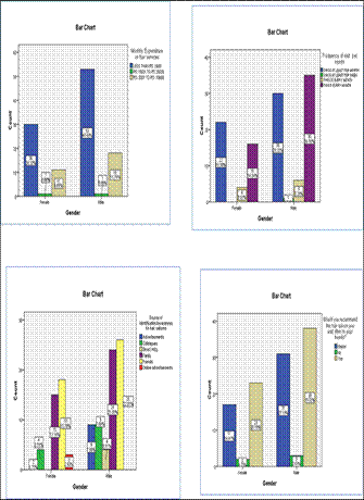 As seen in Figure 4, gender has been related to monthly expenditures on hair salons, frequency of visit per month, source of identification/awareness for hair salons, and recommendation of hair salons.