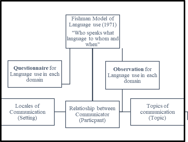 Most of the studied on Language shift and maintenance incorporate Fishman’s domain concept to measure the degree of language shift/maintenance by focusing on the language choice and use in different domains. Fishman’s major theoretical foundations were in the issue of ‘who speaks what language and to whom and when’. It relied on the location, topic and participants. Fishman’s (1971) model of language shift and maintenance specified domains for observing language use. The domains in this study are expanded. Similarly, for validity of the data reported, observations are also made as part of the model. The participant observation was carried out in the homes, social events and gatherings for 10 hours and notes were taken (See Figure 1).