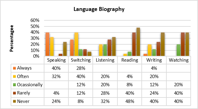 The young Sindhi respondents have no competence in reading (40% rarely and 40% never ) and writing (24% rarely and 40% never); and the majority of the participants reported that they rarely use reading and writing skills in their mother tongue ( see Figure 2 which provides a brief summary of the language biography). Additionally, the participants rarely listen to the language (28% rarely and 32% never). The overall results signify that the Sindhi language has been reduced to spoken discourse (40% always use it) but within it switching to the other language is quite common as 68% reported to switching to other languages. The young Sindhi participants are not reading, writing, listening and even watching the folk tradition (40% rarely and 40 never) in the native language. (See figure. 02 for summary of language biography.)
