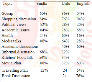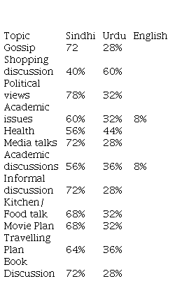 In the home domain participants used English for discussion on academic issues, movie and travelling plans. However for health topics, media talks and shopping discussion Urdu is used and Sindhi is retained for informal discussion, political views and gossip.