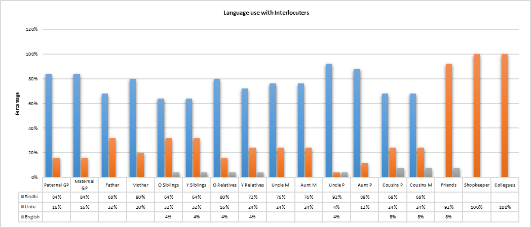 Wedding events and Sindhi Literature Festival held in the month of February was observed with the participants’ consent. It was observed that the participant’s followed the same patterns of language use as reported in the profile with shopkeepers, friends and cousins in both the events. Also, they frequently used English and Urdu with each other and code- mixing patterns were also noted in their communication.