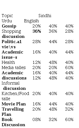 The analysis shows that young Sindhi speakers preferred to use English for discussion on topics related to academia - in this case academic issues, and book discussion. Also when discussing entertainment topics like travelling and movie plans English is the most frequent language used. As for discussions on shopping, health and media Urdu is frequently used. Sindhi is mostly related to topics like gossip, political talk, nature, informal discussion and talk on food as shown in the Table 1.