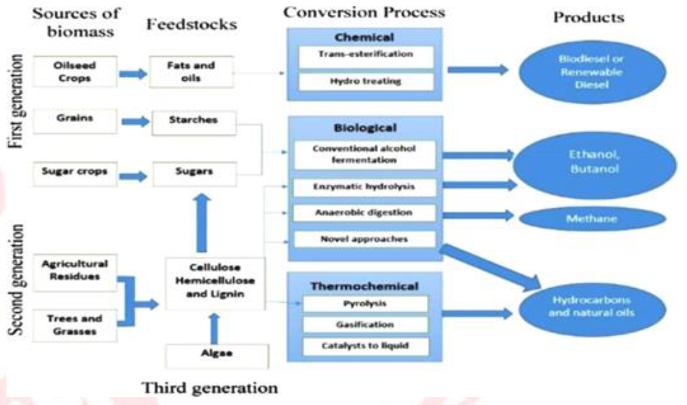 Biofuel is the environmentalists friendly and renewable sourced of alternatives fuel which is mainly produced from animal fats tallow, lard, white or yellow grease, poultry fats, or fish oils; recycled greases used cooking and frying oils; and most commonly, plant oils from soybeans, corn, rapeseed, sunflowers, and cottonseeds, etc. To use this biofuel in diesel engine there is no need for engine modifications as well. In general, the term biofuel is used to represent all the liquid and gaseous transport fuels derives predominating from biomass. Biofuels conversions system is one of the important steps in the whole biofuel production chain. factored such as high yields and low energies consumed are important to consider in promotions the future competitiveness of biofuels to fossil fuels in the market Biofuels can be derives from any biological carbon into biofuel via different production pathways to produce sourced, but photosynthetic plants are the most biodiesel, ethanol, butanol, methane, or other fuels; all are commonly used feedstock. Biofuels are categorizing as the subject of ongoing researches. Technologies to produce into the first- generations biofuel and advanced biofuel second- first- generations fuels are maturing but some feedstock’s are generations, third- generations, etc. Currently, biodiesel and bioethanol are the two most promising biofuel being projecting to replace convenes fossil fuels in transport.