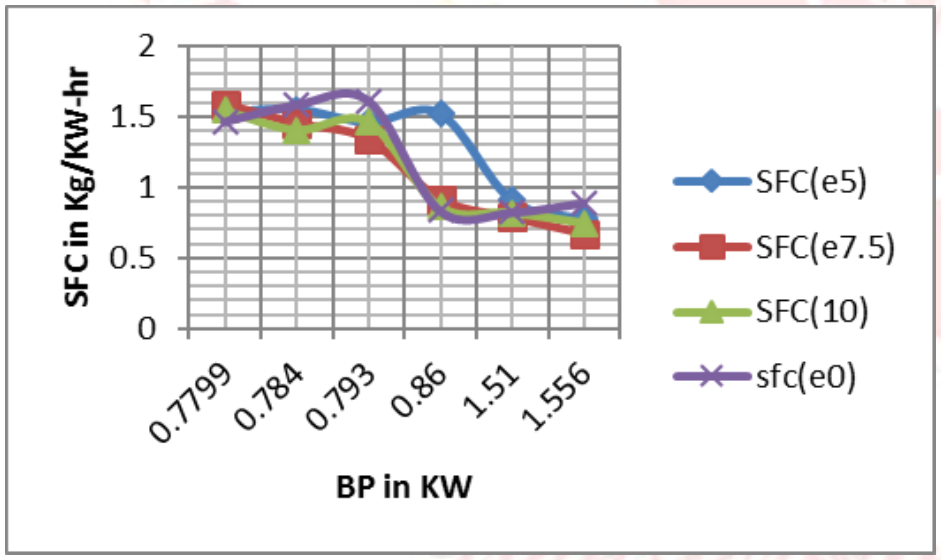 The SFC v/s BP graph for E 7.5 blend of bio ethanol with petrol is in accordance with SFC increases with increase in BP, but for other blends this condition was not satisfied. Hence E 7.5 blend is the optimized blend among remaining all other blends