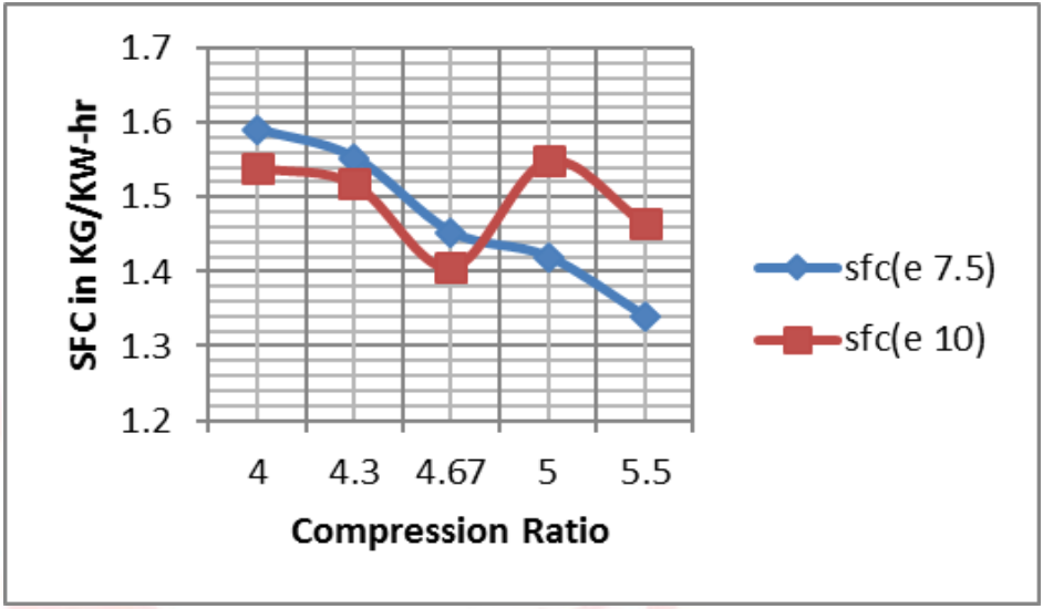 SFC decreases with increase in brake power, Hence E7.5 is the optimum blend for the SI Engine. The BSFC v/s CR graph for E 7.5 blend is in accordance with BSFC decreases with increase in Compression Ratio