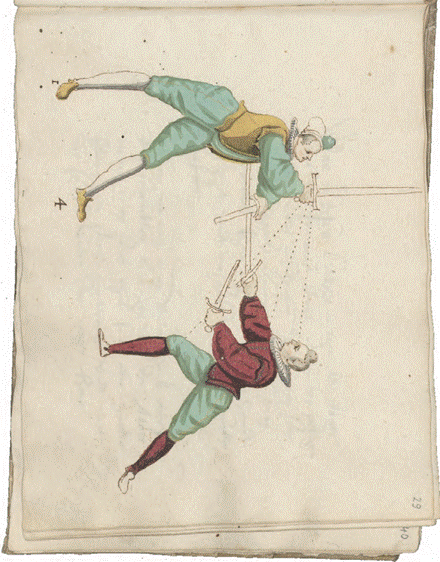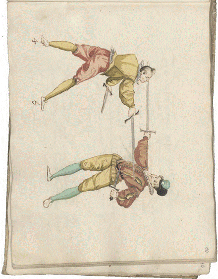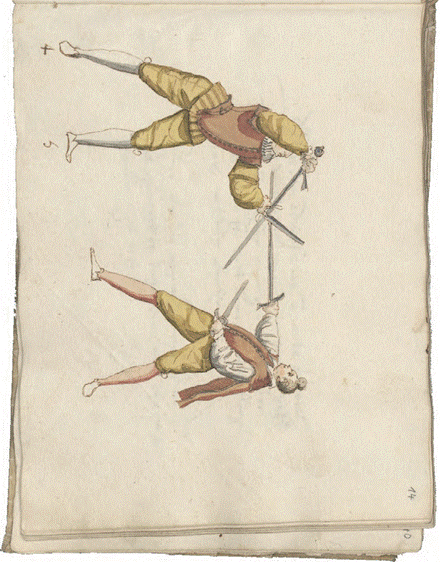 The fight book of Hugold Behr is interesting for several reasons. Firstly, it shows how to fight with rapier and dagger, a fencing system which was quite the novelty at that time in Germany. Secondly, the semantics of the treatise show some interesting features with regards to the technical terms and some examples of code-switching phenomena from German to specific Latin phrases. Thirdly, the treatise is, methodically speaking, highly elaborate due to the fact that the author brings a three-dimensional martial art footwork to life in a two-dimensional fight book. This author – an anonymous German fencer who had presumably journeyed to Venice – was probably inspired by Italian fight books. What one finds in Hugold Behr’s fight book is thus a kind of humanist-enhanced symbiosis of the Italian and German fight book traditions.