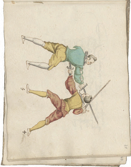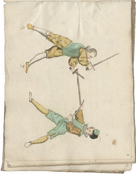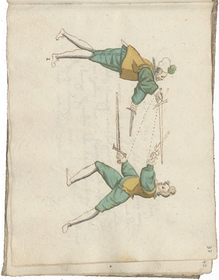 Zum anderen magstu in geleichem streich nach dem rechten ohr die clinge sincken lassen et admoto pede dextro mit einem vollen stich nach der brust außfahrn.