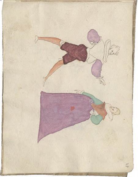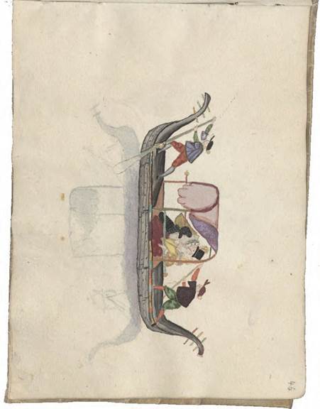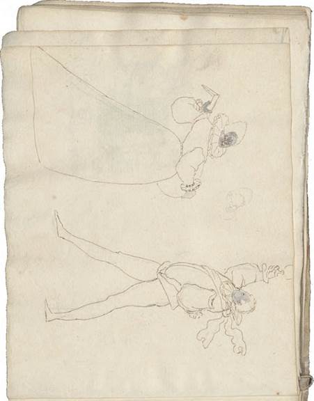 While the fight book part of the manuscript (fols 1r-39r) uses twenty-nine drawings to illustrate its text, the second part (fols 40v-51r) consists of sketches including – finished as well as unfinished – drawings of a lady on a horse, several men and women in different poses, portraits, and a Venetian gondola in which there is a couple being intimate. According to Rainer Leng, a single sketch on folio 50r may have been drawn by a second hand, as it differs in some ways to the hand that illustrated the fight book and was responsible for the other sketches and drawings.25