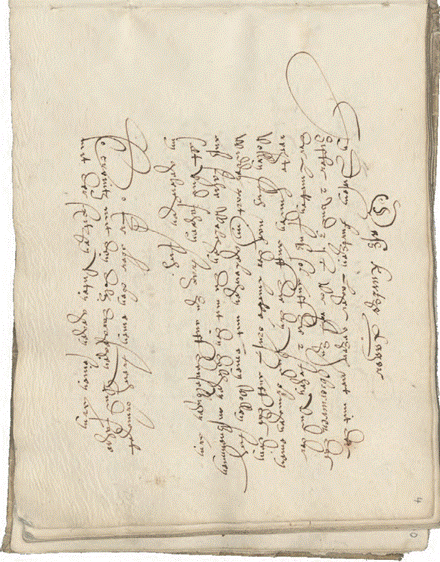 In disem langen lager ist anfenclich zu mercken das man mit dem rechten fuß mus vorn steyn undt wan als der adversarius einen stich oder streich nach der rechte seitten dhut demselbigen mit langen cruitzen ausszunemmen et admoto pede sinistro in signum 5 einen stich mit dem dolch zu dhun.