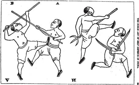 Pugilism—The art of self-defense is regularly taught in China. It is much practiced, although not countenanced by the local governments. In the penal code, nothing appears concerning it. Tracts are printed which would, in all probability, accompanied by their wood-cuts, amuse the fancy in England. The Chinese have no pitch battles that we ever heard of; but we have seen a pamphlet on the subject of boxing, cudgeling, and sword-exercise, in which there are many fanciful terms.