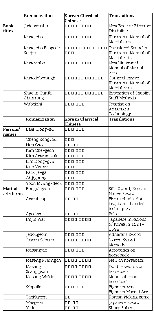 The Muyedobotongji, which is based on East Asian martial arts traditions, shows how martial arts were produced, developed, and evolved in Korea while also adapting to social preferences and needs. The Imjin War was a turning point. Joseon started to devise a new martial arts system to cope with the changing military situation and even tried to incorporate Chinese and Japanese martial arts, when relevant and necessary, to improve Joseon’s military system. From a contemporary Korean perspective, the Muyedobotongji was the result of the best selection of the best practices. In the Muyedobotongji, there was no nationalistic view of Korean martial arts (as is prevalent in the Korean martial arts world today) but a solely a pragmatic perspective.