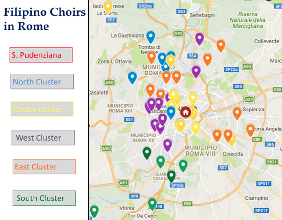 The case of the Filipinos, a particularly important community because of its size, is to be considered in this context. As we will see, the Filipinos are known all over the world for the quality of their choruses and even those who live in Rome are particularly proud of the care their educational system reserves for music and singing. For this community choral activity is one of the most important factors in the division and organisation of the urban space.