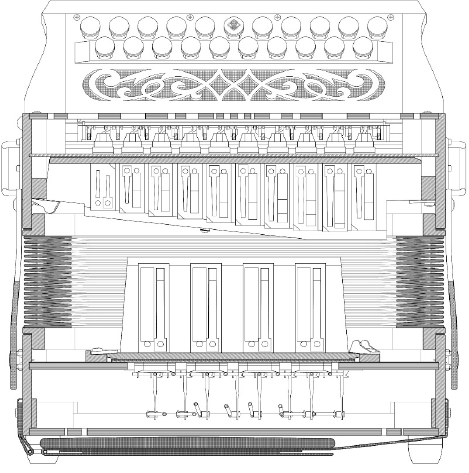 It is important to point out that diatonic accordion makers do not make the reeds, bellows and accessories themselves. Mechanical bellow aerophones are assembled from a huge number of components: a small accordion has more than 950 parts. An example of this is the Studio, Castagnari’s eight-bass model with two melodic rows (Fig. 3). Components are made by four specific categories of craftsmen: the musical instrument, the reed, the bellows and the accessories each have their own maker.