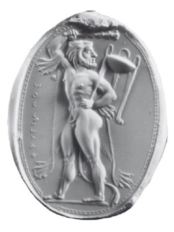 Die Namen auf antiken Gemmen und Kameen waren seit dem 15. Jahrhundert Thema unter gelehrten Sammlern und Liebhabern. Aber erst Adolf Furtwängler wies den Weg, anhand der Namen eine Geschichte der Steinschneider und der antiken Glyptik zu erschliessen und zwischen Künstlersignatur und Besitzerangabe im wesentlichen zu unterscheiden. Erika Zwierlein–Diehl hat darüber vor fast 30 Jahren ausführlich informiert1 und danach vor 10 Jahren den Weg der Forschung bis hin zu Furtwängler und darüber hinaus vertieft nachgezeichnet2. Teil dieses Phänomens ist es, dass seit dem 18. Jahrhundert antike Namen auch auf neuzeitlichen Gemmen auftauchen und dass antike Gemmen samt ihren Namensnennungen kopiert werden3. Und nicht immer standen diese antiken Namen auf nachantiken Gemmen mit Täuschungsabsicht4, dies muss jeweils die Einzeluntersuchung entscheiden. Das Thema wurde von Angela Berthold in einem ersten Versuch 2009 wieder aufgegriffen und der Fokus auf die beiden Steine des Gemmenschneiders Phrygillos konzentriert5, auf den verschollenen Karneol mit dem kauernden Eros (Abb. 1–2)6 und den Chalzedon mit Herakles als Sieger im Dreifussstreit (Abb. 3–4)7. Der Karneol mit Eros wurde zuerst 1760 publiziert8, der Herakles-Stein ist seit der »Mitte der siebziger Jahre« des vorigen Jahrhunderts bekannt, und 1981 wurde er zuerst publiziert9. Seit 1845 ist bekannt, dass ein Münzstempelschneider Phrygillos im späten 5. Jahrhundert v. Chr. Silbermünzen von Syrakus signierte10. Seitdem suchte die Frage, ob der Gemmenschneider Phrygillos und der Münzstempelschneider Phrygillos ein und dieselbe Person sind, nach einer Antwort. E. Zwierlein-Diehl hat vor über 20 Jahren alle Beobachtungen und Argumente zusammengetragen und sich mit Überzeugung für die Einheit der Person entschieden11. A. Berthold entwickelt in dem Aufsatz von 2009 keine erkennbare Fragestellung und gelangt folglich auch nicht zu einem Ergebnis (»Phrygillos war … ein griechischer Stempelschneider … Ob er gleichzeitig als Gemmenschneider tätig war, kann heute nicht mehr entschieden werden«12).