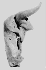 In den Kulten, in denen die Maske als Ritualgerät verwendet wurde, hatte das Tier eine ausgeprägte symbolische Bedeutung; die tierhaften Elemente, welche die Ikonographie der Maske bestimmten, gingen einher mit der Präsenz des Tieres in Religion und Ritual. Funde aus dem bronzezeitlichen Zypern lassen auf eine schon früh vorhandene Tradition der Tiermaskierung im rituellen Kontext schliessen; sie ist in den letzten Jahrhunderten des 2. Jahrtausends v. Chr. anhand von entsprechend bearbeiteten Stierschädeln nachgewiesen40. Auch Terrakottaund Steinfiguren archaischer Zeit zeigen die Verwendung eines Stierkopfes als Maske (Abb. 8). Statuetten dieser Art existieren auf der Insel seit zypro-geometrischer Zeit, das früheste Beispiel wird zwischen 1050 und 950 v. Chr. datiert41. Die Mehrzahl stammt aber, wie das hier gezeigte Exemplar, aus dem 6. – frühen 5. Jahrhundert v. Chr. (CA II), aus den Jahrhunderten zwischen der zypro-geometrischen und frühen zypro-klassischen Periode42. Sie kamen mehrheitlich in Heiligtümern zutage, in denen nicht nur maskentragende Statuetten, sondern auch die theriomorphen Masken selbst gefunden wurden. Eine rituelle Verwendung der Tiermasken scheint daher wahrscheinlich43.