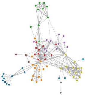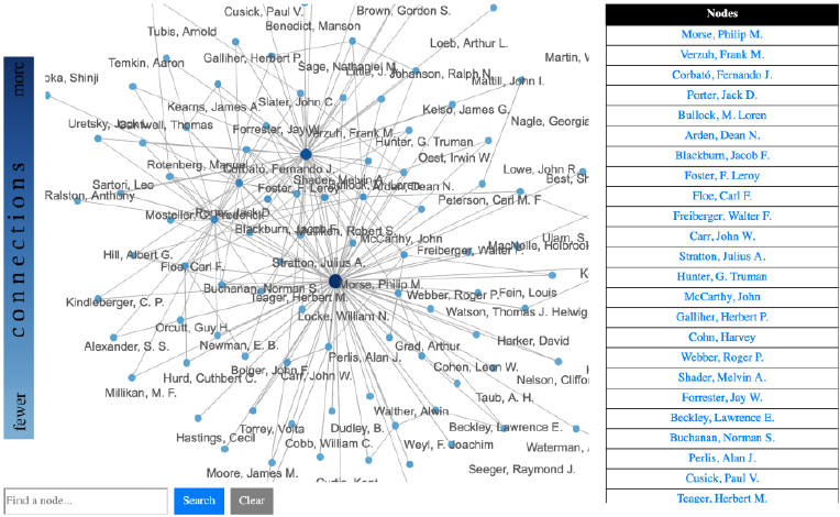Ähnlich wie interaktive Karten gehören auch Netzwerke zu den weit verbreiteten Datenvisualisierungen. Insbesondere im Umkreis der Digital Humanities wurden bereits Stimmen laut, dass zu viele Netzwerkvisualisierungen produziert würden.29 Dennoch kann die Visualisierung von Knoten und Kanten (Nodes und Edges) über Graphen (gerichtet oder ungerichtet) zur Identifikation von Beziehungen hilfreich sein. Aufgrund der Einführung von Graphen anstelle von relationalen Datenbanken zur Formulierung von Aussagen, etwa im Zusammenhang mit Linked Open Data,30 ist der Einsatz von Netzwerkvisualisierungen ausgesprochen verlockend geworden. Insbesondere interaktive Ansätze, die Graphen an einem bestimmten Punkt (einer Person/einem Ort) anzusetzen und von dort aus Beziehungen aufzuzeigen, sind von hohem heuristischem Wert, da im Beziehungsnetz über mehrere Kanten und Knoten einer Spur gefolgt werden kann. Unter Diskussion der Datenmodellierung hat dies Andreas Kuczera am Beispiel der Regesta Imperii aufgezeigt.31
