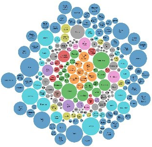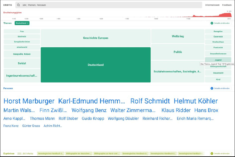 Aufbauend auf die Timelines wurden TreeMaps sowie Wordclouds für die Bestände der Deutschen Nationalbibliothek (DNB) erstellt. Sie visualisieren zusätzlich zu den chronologischen Daten weitere Informationen wie Schlagwörter und stellen somit zusätzliche Zugangsformen bereit. Diese Informationen werden logarithmisch