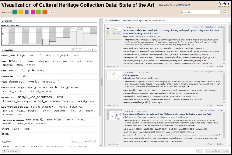 Florian Windhager u. a. haben in der Studie «Visualization of Cultural Heritage Collection Data: State of the Art and Future Challenges» 19 eine umfassende Übersicht der Aspekte zusammengetragen, auf die es bei der Präsentation von kulturellen Sammlungen aus Bibliotheken, Archiven und Museen zu achten gilt. Ihr Augenmerk liegt dabei auf Interfaces, die mehr bieten als die bei digitalen Sammlungen weit verbreitete Stichwortsuche und der darauf folgenden Präsentation der Resultate im Kachellayout. Stattdessen ermöglichen Informationsvisualisierungen mit Sammlungsdaten neue Analyseformen und Zugänge sowohl für ein wissenschaftliches als auch ein breites Publikum. Dazu kommt, dass interaktive Visualisierungen es erlauben, komplexe und umfangreiche Informationsräume zu erkunden.20 Die in der Studie berücksichtigten Beispiele von Informationsvisualisierungs-Systemen können auf http://collectionvis.org/ selbst in einem interaktiven Browser erkundet und mit verschiedenen Schlagwörtern gefiltert werden. Die eingesetzte Webseiten-Struktur SurVis, die somit selbst eine Zugangsform darstellt, ist open source verfügbar.21