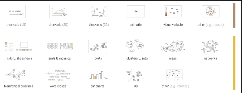 In ihrer Analyse zeigen Windhager u. a. auf, dass die Visualisierung zeitabhängiger Daten innerhalb von sechs Kategorien erfolgen kann: Zeitstrahl (1D), Zeit als eine von zwei räumlichen Dimensionen (2D), Zeit als eine von drei räumlichen Dimensionen (3D), Animation, visuelle Variablen (Abbildung von Zeit durch Farbe, Grösse oder Textur) und andere Codierverfahren (beispielsweise Ringdiagramme). Weitere nicht-zeitliche Visualisierungsmethoden sind: Listen und Slideshows, Raster und Mosaike, Plots, Cluster und Sets, Karten, Netzwerke, hierarchische Diagramme, Wortwolken, Säulendiagramme, räumliche Visualisierungen und weitere Codierverfahren (beispielsweise Kreisdiagramme oder Liniendiagramme).23