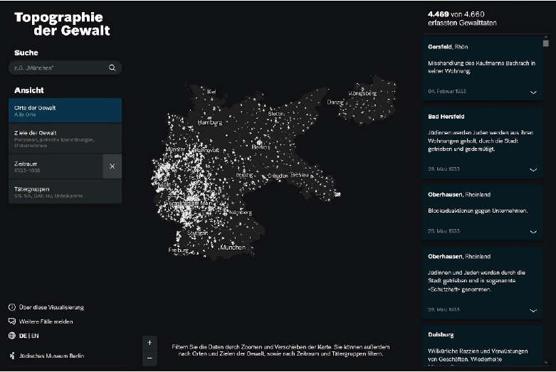 Eine Vielzahl an Datenpunkten, die geografisch visualisiert werden, ist beispielsweise auch der Ansatz der Anwendung Topographie der Gewalt – Antisemitische Gewalttaten in Deutschland 1930–1938, die aus einer Projektkooperation zwischen dem Urban Complexity Lab (Fachhochschule Potsdam) und dem Jüdischen Museum Berlin hervorgegangen ist. In der Visualisierung werden Gewalttaten gegenüber Jüdinnen und Juden, jüdischen Einrichtungen, Geschäften und Unternehmen im Deutschen Reich aufgezeigt, die in den 1930er Jahren verübt wurden. Die vorhandenen Informationen der Gewalttaten werden auf einer Karte (wie oben abgebildet) oder in anderen Ansichten auch in einem Blasendiagramm, auf einem Zeitstrahl und in Ringdiagrammen visualisiert. Die verschiedenen Visualisierungsformen sind miteinander verknüpft, wodurch vorgenommene Eingrenzungen, z. B. des Zeitraums, sich auf die anderen Darstellungen auswirken. Zum bisher Beschriebenen kommt ein partizipativer Aspekt hinzu: Nutzerinnen und Nutzer der Anwendung können ihnen bekannte weitere Fälle unter Angaben von Quellen melden. Der dynamische Wechsel von einer Ansicht in eine andere ist ein Ansatz, der bezeichnend für die Visualisierungs-Projekte des Urban Complexity Labs ist, von denen in dieser Studie noch weitere besprochen werden.28