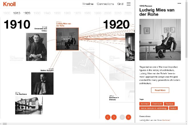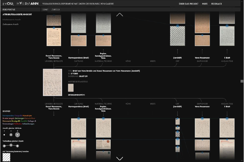Mark-Jan Bludau, Marian Dörk und Frank Heidmann stellen im Zusammenhang mit der experimentellen Visualisierung Raoul Hausmann ein Konzept vor, gemäss dem mittels mehrerer Visualisierungen relationale Perspektiven von einzelnen Artefakten aus kulturellen Sammlungen aufgezeigt werden sollen. An der gleichzeitigen Darstellung der Komplexität und Einzigartigkeit von Artefakten scheitern viele gängige Visualisierungstypen.32 Die Visualisierung Raoul Hausmann ist als Masterarbeit von Mark-Jan Bludau an der Fachhochschule Potsdam entstanden. Visualisiert werden Dokumente aus dem Nachlass des Berliner Dadaisten Raoul Hausmann (1886–1971), der in der Berlinischen Galerie aufbewahrt wird und aus Gemälden, Zeichnungen, Fotografien, Collagen, Fotomontagen, Manuskripten, persönlichen Notizen, Zeitungsausschnitten und Briefen besteht. In der Visualisierung geben nach Gattungen aufgeteilte Raster zunächst eine grobe Übersicht über die ganze Sammlung, während die Balken am linken Seitenrand die chronologische Verteilung der Dokumente auf einem Zeitstrahl aufzeigen. Am rechten Seitenrand werden gleichzeitig vorkommende Personen und Körperschaften aufgelistet und ihre Beziehungen in einem Bogendiagramm dargestellt. Sowohl die Zeitleiste als auch die Personenliste dienen als Filter für die Miniaturvorschauen der Dokumente. Sobald ein Dokument angeklickt wird, wechselt das Interface zu einer Ansicht, in der – wie in der Abbildung oben – vielfältige Beziehungen zwischen verschiedenen Dokumenten hergestellt