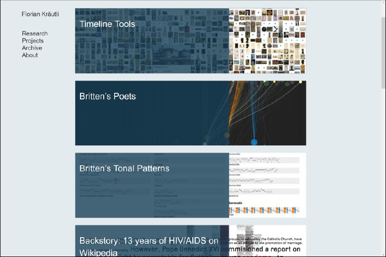 Exploring Digital Collections Through Timeline Visualisations33 hat Florian Kräutli untersucht, wie zeitbasierte Formen der Datenvisualisierung ermöglichen, in digitalen Sammlungen Wissen zu entdecken. Interaktive Zeitstrahle gehen über ein lineares Storytelling hinaus und werden zu Werkzeugen für visuelle Analysen. Ausgehend von den in digitalen Sammlungen erfassten Datierungen hat Kräutli die Auswirkung kuratorischer Entscheidungen auf die Sammlungsdaten untersucht und auch gezeigt, wie diese Entscheidungen in einem Zeitstrahl sichtbar gemacht werden können. In enger Zusammenarbeit mit Kulturinstitutionen und den zuständigen Kuratorinnen und Kuratoren hat er funktionsfähige Prototypen erstellt, um aufzuzeigen, wie umfangreiche digitale Sammlungen visualisiert und das darin enthaltene Wissen zugänglich und nutzbar gemacht werden kann. Die Repräsentation von ungenauen, beschreibenden Zeitangaben, wie sie in digitalen Sammlungen oft vorkommen, haben in diesen Prototypen einen besonderen Stellenwert erhalten.34 Kräutli betont die Wichtigkeit des frühen Einbezugs von auf Datenvisualisierung spezialisierten Designerinnen und Designern in Digital Humanities Projekte: Idealerweise sind sie von Anfang an dabei und gestalten sowohl die Konzeption als auch die spätere Umsetzung der Projekte mit. Nur in der interdisziplinären Zusammenarbeit von Designer*innen mit Geisteswissenschaftler*innen (womit sowohl Digital Humanists als auch Fachwissenschaftler*innen gemeint sind) können die Methoden der jeweiligen Disziplin wechselseitig fruchtbar eingesetzt werden. So ist der Beitrag, der vonseiten des Designs zur visuellen Repräsentation von Wissen geleistet werden kann, nicht zu unterschätzen.35